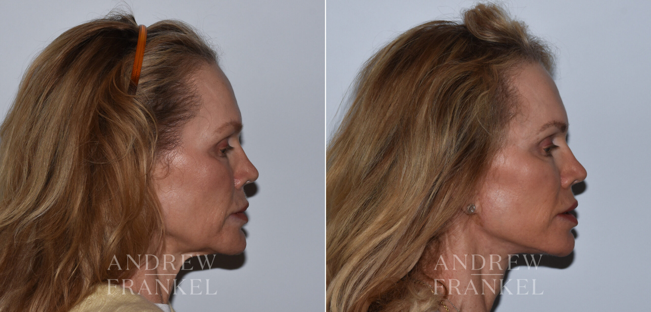 A facelift with platysmal plication and removal of a prior chin implant was performed in conjunction with fat injections to the temples to rejuvenate and soften this woman’s appearance. Photos were taken seven months post-surgery.