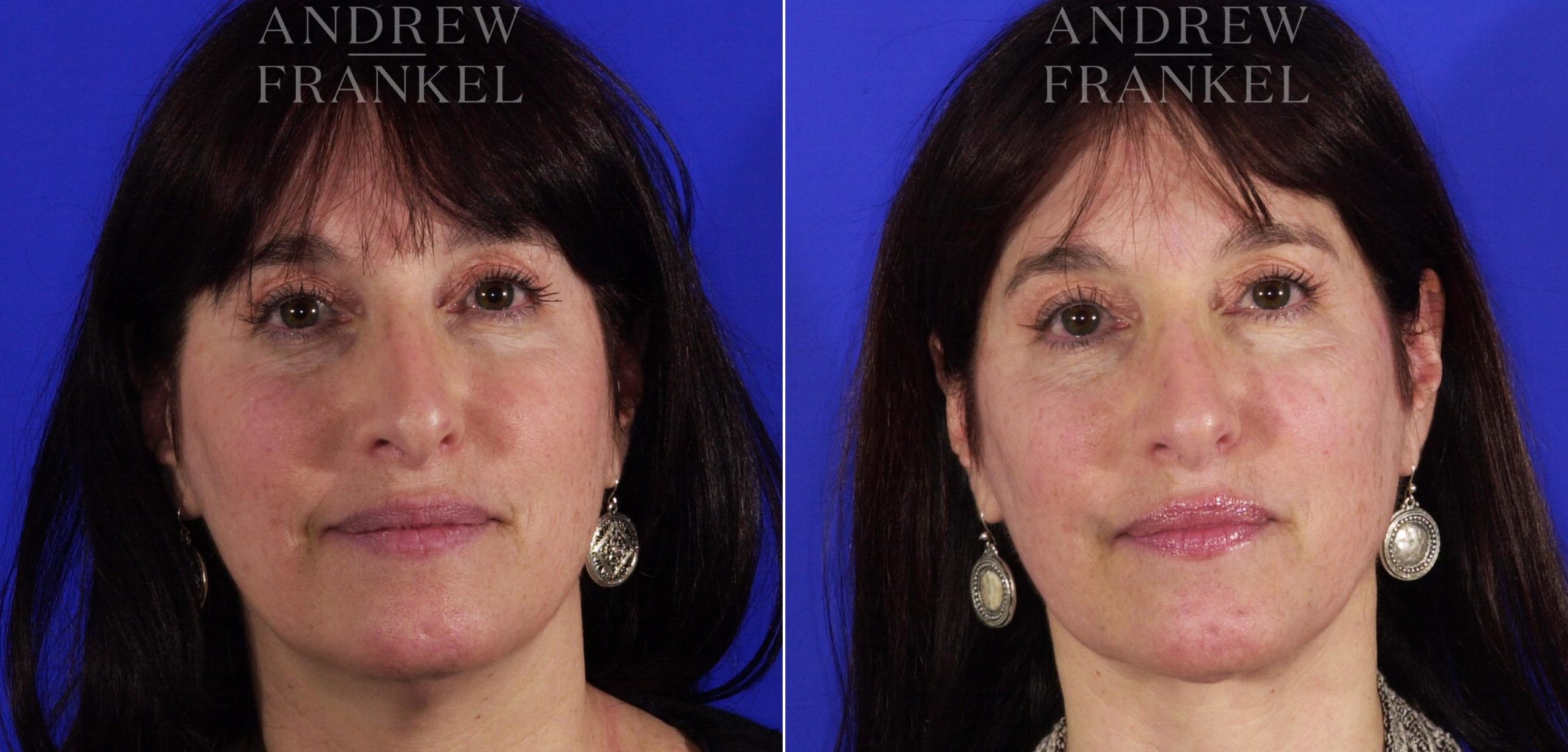This woman requested that we improve the neck area and jawline but without any incisions around her ears. This nice outcome was achieved using only a small incision under the chin. The underlying muscles were tightened and fat removed in the deeper space between them. Often this type of limited procedure can yield exceptional results without the need for any skin tightening or incisions around the ears.