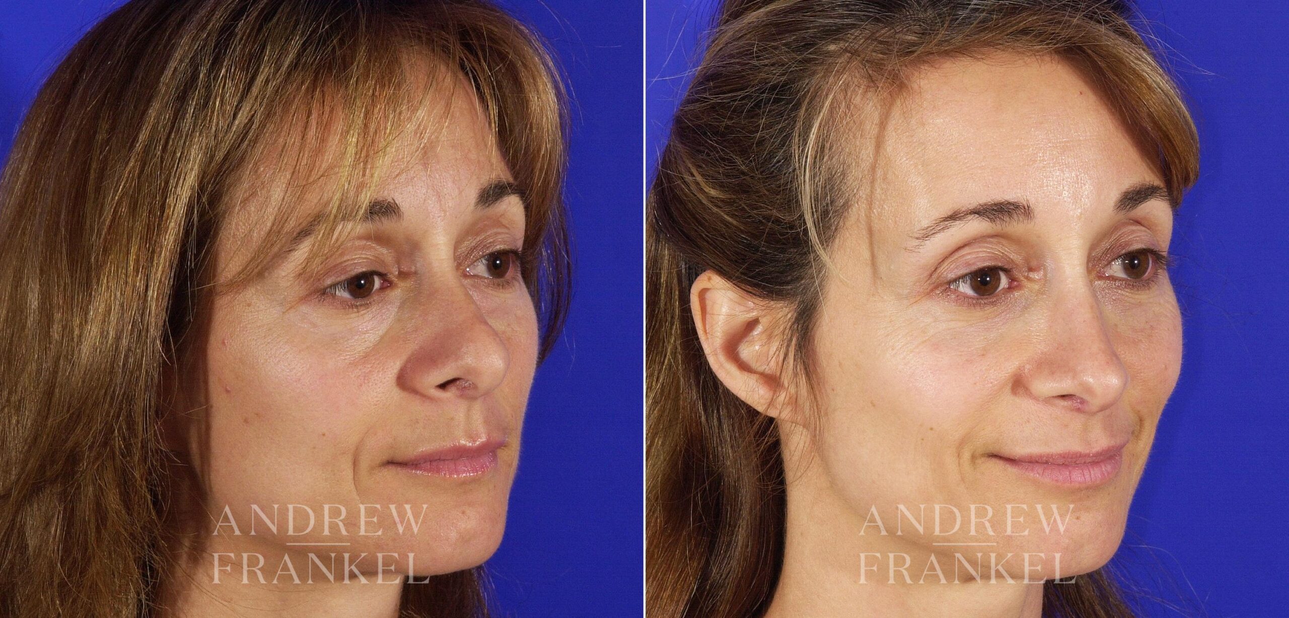 This woman had undergone prior nasal surgery and was displeased with her profile and the size of her tip. Additionally she felt she looked tired. In conjunction with her open revision rhinoplasty she also had a lower eyelid surgery with fat repositioning to improve the "bags" creating dark circles. You can view a diagram of her procedure here.