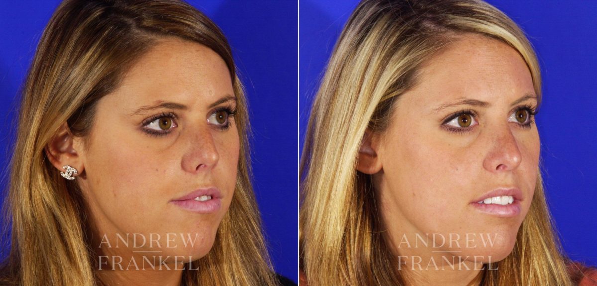 This young woman was born with a very short nose, a convex profile, and tension between her upper lip and columella. She wanted to address these things but maintain her overall look without a drastic change. Correction involved a complicated series of maneuvers involving multiple grafts harvested from her septum.