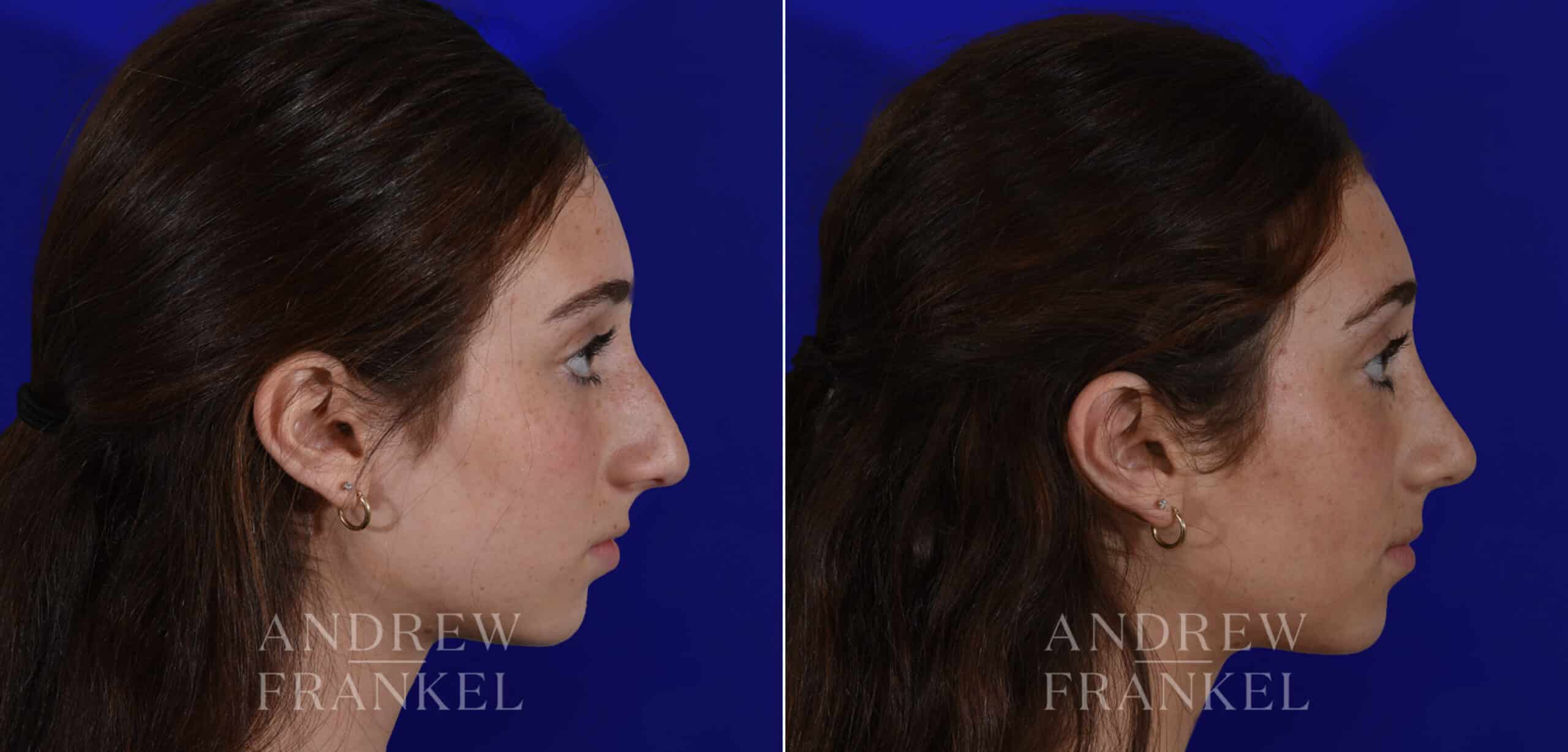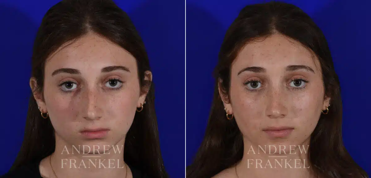 Trauma caused this lovely girl’s nose to deviate and adversely impacted her breathing. As can be seen on the base view, her entire nose was drifting to her right side. Surgery was successful in correcting her breathing and rendering a straighter, prettier nose that still looks natural.